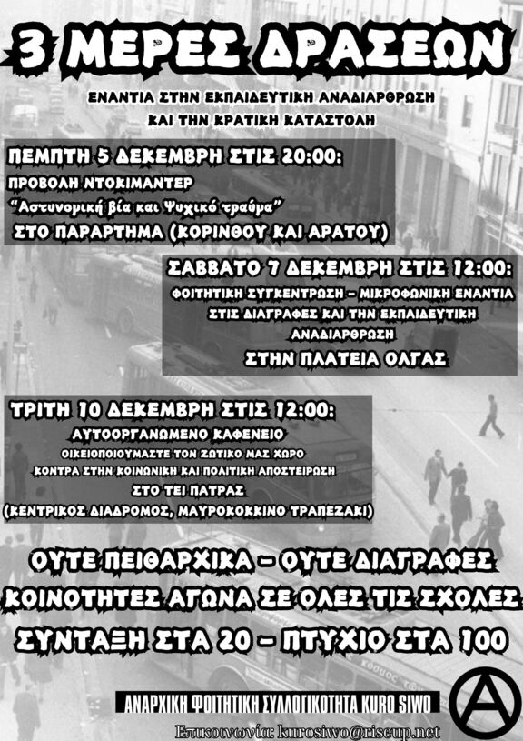 Προβολή του ντοκιμαντέρ "Αστυνομική Βία και Ψυχικό τραύμα", στο πλαίσιο του προγράμματος δράσεων ενάντια στην εκπαιδευτική αναδιάρθρωση και την κρατική καταστολή.