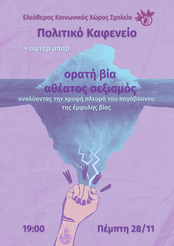 Από ένα σεξιστικό σχόλιο ή ένα επίμονο βλέμμα μέχρι ένα χέρι που σηκώνεται και μια αδελφή μας λιγότερη, τα βήματα είναι τόσο πολλά και τόσο λίγα ταυτόχρονα. Αυτή η απόσταση είναι όμως το σημείο στο οποίο οφείλουμε να σταθούμε και να υψώσουμε τείχη προστασίας και γέφυρες συνάντησης για το γκρέμισμα των έμφυλων διαχωρισμών και την συγκρότηση μιας ισότιμης και αλληλέγγυας κοινωνίας.Με αφορμή την διεθνή ημέρα για την εξάλειψη της έμφυλης βίας η Ομάδα Διαχείρισης Έμφυλων Περιστατικών του Ελεύθερου Κοινωνικού Χώρου Σχολείο καλεί την Πέμπτη 28/11 στις 19:00 σε ένα πολιτικό καφενείο με θέμα «Ορατή βία- Αθέατος σεξισμός: Αναλύοντας την κρυφή πλευρά του παγόβουνου της έμφυλης βίας».