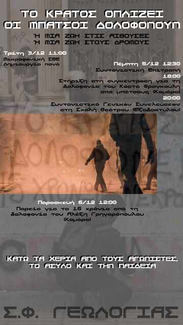 Δεκαέξι χρόνια μετά τη δολοφονία του Αλέξη Γρηγορόπουλου από τον ειδικό φρουρό Κορκονέα, η έσχατη μορφή της κρατικής βίας είναι πιο επίκαιρη από ποτέ αφού κάθε χρόνο μετράμε δολοφονημένους από χέρια μπάτσων. Ο Φραγκούλης, ένα ανήλικο Ρόμα παιδί, τραυματίστηκε θανάσιμα για 20 ευρώ βενζίνη μια μέρα πριν από τα 14 χρόνια της δολοφονίας του Γρηγορόπουλου, Ο Μιχαλόπουλος, ο Σαμπάνης, ο Κώστας Μανιουδακης είναι μερικά από τα θύματα του σάπιου εξουσιαστικού συστήματος και της θανατοπολιτικής τους.