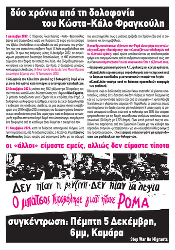 5 Δεκέμβρη 2022: O 16χρονος Ρομά Κώστας -Κάλο- Φραγκούλης έφυγε από βενζινάδικο χωρίς να πληρώσει 20 ευρώ για τα καύσιμα που έβαλε. Ακολούθησε η καταδίωξή του από μπάτσους που γνώριζαν πως στο αυτοκίνητο επέβαινε Ρομά. Ο Κάλο πυροβολήθηκε στο κεφάλι. Το πρωί της επόμενης μέρας, 6 Δεκέμβρη 2022, σε συγκέντρωση μπροστά στα δικαστήρια Θεσσαλονίκης, τα ΜΑΤ χτύπησαν και σώριασαν στο έδαφος τον πατέρα του Κάλο. Μια βδομάδα μετά ανακοινώθηκε και τυπικά ο θάνατoς του Κάλο. Ο δολοφόνος μπάτσος κυκλοφορεί ελεύθερος. Η δίκη του θα διεξαχθεί στο Μικτό Ορκωτό Δικαστήριο Βέροιας στις 13 Ιανουαρίου 2025.