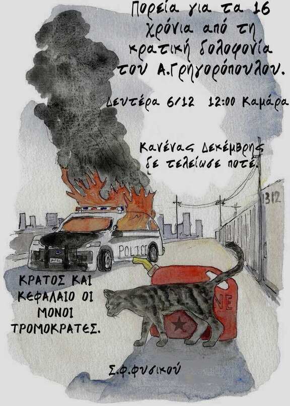 Κλείνουμε πλέον 16 χρόνια από την εν ψυχρώ δολοφονία του 15χρονου Αλέξη Γρηγορόπουλου από το ένστολο κάθαρμα Κορκονέα στα Εξάρχεια. Δεν γίνεται τα αγνοήσουμε τα εξεγερσιακά χαρακτηριστικά που είχε λάβει συνολικά ο Δεκέμβρης του '08, ως μια έμπρακτη πυροδότηση της οργής της κοινωνικής βάσης μέσα σε μία συνολική συνθήκη οικονομικής και κοινωνικής εξαθλίωσης. Η είδηση, παράλληλα, της κρατικής δολοφονίας δεν άργησε να εξαπλωθεί σε όλη την επικράτεια, δημιουργώντας από τις πρώτες στιγμές την σπίθα που θα γινόταν η πυρκαγιά του Δεκέμβρη του '08. Και αυτή η φλόγα είναι άλλωστε που έρχεται να φωτίσει τους αγώνες του σήμερα, να χαραχθεί ως συλλογική μνήμη και να μας υπενθυμίζει ότι η κρατική βαρβαρότητα και πόσο μάλλον ο αγώνας μας απέναντι στο τέρας της εξουσίας δεν αρχίζει ούτε και τελειώνει στον Δεκεμβρη.
