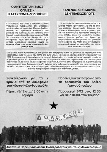 Στηρίζουμε τη συγκέντρωση για τα 2 χρόνια από τη δολοφονία του Κώστα-Κάλο Φραγκούλη την Πέμπτη 5/12 στις 18:00 στην Καμάρα και τις πορείες για τα 16 χρόνια από τη δολοφονία του Αλέξη Γρηγορόπουλου 6/12 στις 12:00 και στις 18:00 στην Καμάρα
