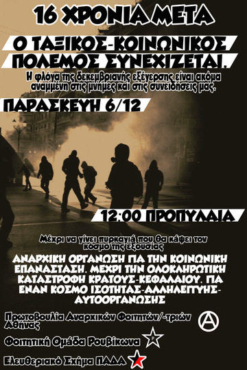 Δεκαέξι χρόνια μετά την δολοφονία του αναρχικού μαθητή Αλέξανδρου Γρηγορόπουλου από τους μπάτσους Κορκονέα και Σαραλιώτη, η κρατική βία, θανατοπολιτική και τρομοκρατία κάνουν την εποχή μας ολοένα και πιο ασφυκτική και την ανάγκη να δοθούν απαντήσεις ακόμα πιο επιτακτική. Ως τάξη των καταπιεσμένων δεχόμαστε καθημερινά τις σφαίρες του πολέμου που μαίνεται, με αναρίθμητα και πολλές φορές άγνωστα τα θύματά του- στα αστυνομικά τμήματα, στους χώρους εργασίας, στους δρόμους, στα υδάτινα και χερσαία σύνορα, στην αφάνεια.