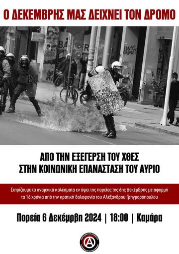 16 χρόνια μετά την κοινωνική και ταξική εξέγερση, που ακολούθησε τη δολοφονία του Αλ. Γρηγορόπουλου τον Δεκέμβρη του 2008, οι εκμεταλλευόμενοι και οι καταπιεσμένοι συνεχίζουν να πληρώνουν με το αίμα τους τη διατήρηση και αναπαραγωγή του βάρβαρου εκμεταλλευτικού και καταπιεστικού συστήματος, που καταδυναστεύει, δολοφονεί, εξαθλιώνει και καταστρέφει τις κοινωνίες και τον φυσικό κόσμο. 16 χρόνια μετά η αντιεξεγερτική εκστρατεία του κράτους κλιμακώνεται σε όλα τα σημεία του κοινωνικού και ταξικού ανταγωνισμού -από την επίθεση στις καταλήψεις, στο άσυλο των πανεπιστημίων και τους απεργιακούς και συνδικαλιστικούς αγώνες μέχρι το χτύπημα των διαδηλώσεων και τη σωρεία διώξεων, προφυλακίσεων και φυλακίσεων αναρχικών αγωνιστών. Ταυτόχρονα οι ιδεολογικοί και κατασταλτικοί μηχανισμοί του κράτους επιχειρούν το παραδειγματικό χτύπημα του αναρχικού κινήματος τόσο γιατί αυτό υπήρξε βασικός εκφραστής, όλη την μεταπολιτευτική περίοδο, των αδιαμεσολάβητων και ριζοσπαστικότερων κοινωνικών και ταξικών αγώνων όσο και γιατί στοχεύουν στην τρομοκράτηση ολόκληρης της κοινωνίας και των αντιστάσεών της. Η εξέγερση του Δεκέμβρη είναι σήμερα ζωντανή ως πρόταγμα, όχι για την επανάληψή της, αλλά για την υπέρβασή της από τους ίδιους του αγωνιζόμενους στην προοπτική της Kοινωνικής Eπανάστασης.