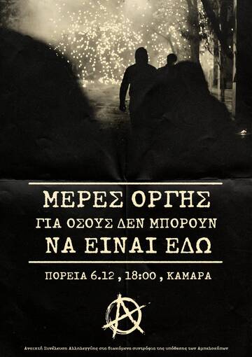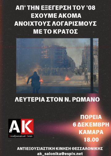 ΥΓ. Ο φετινός Δεκέμβρης έχει μια ιδιαιτερότητα καθώς βρίσκει το κινημα να δέχεται μια οξεία επίθεση στις δομές, αλλά και τους ανθρώπους του. Το Κράτος αποφάσισε, λίγες ημέρες πριν την επέτειο της δολοφονίας του Αλέξη, να προφυλακίσει χωρίς κανένα στοιχείο (μισό αποτύπωμα σε μια σακούλα μέσα σε ένα διαλυμένο διαμέρισμα δεν αποτελεί στοιχείο) τον αδερφικό του φίλο, τον άνθρωπο στα χέρια του ξεψύχησε εκείνο το βράδυ, τον αναρχικό αγωνιστή Νίκο Ρωμανό, ενώ το έργο επαναλήφθηκε λίγες μέρες μετά με ακόμη μια πανομοιότυπη σύλληψη. Ταυτόχρονα τα ΜΜΕ παίζουν και πάλι το χαρτί της τρομολαγνείας επάνω σε νεκρούς, τραυματίες και φυλακισμένος/ες αναρχικούς/ες. Αυτό πρέπει να μας δώσει ακόμη ένα κίνητρο για μαζική παρουσία στις διαδηλώσεις της 6ης Δεκέμβρη.