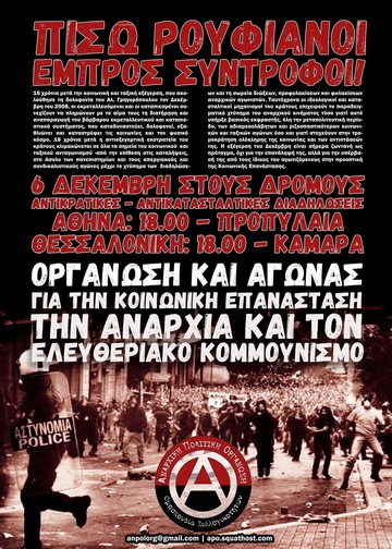 Η σημερινή 6η Δεκέμβρη έχει ένα ακόμα ιδιαίτερο βάρος και βάθος καθώς ένας ακόμα αναρχικός αγωνιστής, ο Κυριακός Ξυμητήρης, έπεσε νεκρός στη μάχη για την κοινωνική και ταξική απελευθέρωση, ενώ 5 ακόμα αγωνιστές και αγωνίστριες, μεταξύ αυτών και ο Νίκος Ρωμανός, έχουν προφυλακιστεί και κατηγορούνται με βαρύτατες κατηγορίες για μια κακοστημένη υπόθεση από αυτές που η «αντι»τρομοκρατική υπηρεσία συνηθίζει να στήνει.