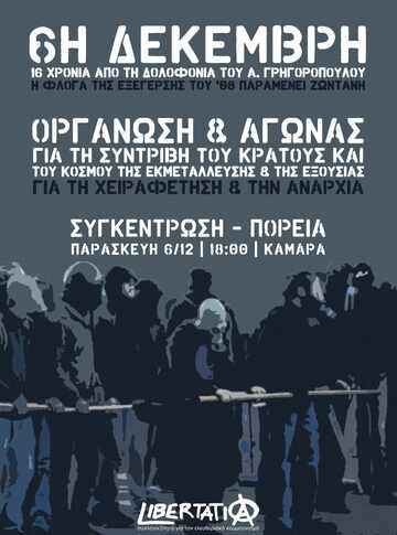 16 Χρονιά έχουν περάσει από την 6η Δεκέμβρη του 2008. Τότε που ο μπάτσος Ε. Κορκονέας δολοφόνησε εν ψυχρώ τον αναρχικό μαθητή Αλέξανδρο Γρηγορόπουλο στα Εξάρχεια. 16 χρόνια από την μεγάλη εξέγερση που ακολούθησε, αυτής των αναρχικών, των από-τα-κάτω, της νεολαίας χωρίς αύριο, που αποτέλεσε την πιο λυσσαλέα επίθεση της σύγχρονης εποχής στο εγχώριο κρατικό - καπιταλιστικό σύστημα.