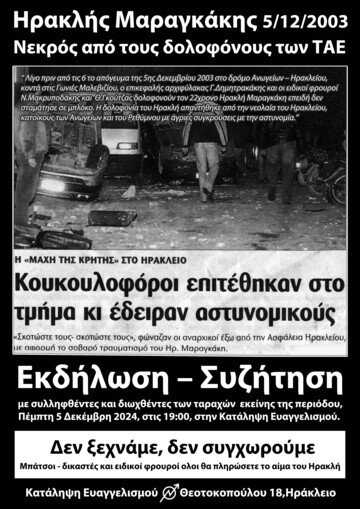" Λίγο πριν από τις 6 το απόγευμα της 5ης Δεκεμβρίου 2003 στο δρόμο Ανωγείων - Ηρακλείου, κοντά στις Γωνιές Μαλεβιζίου, ο επικεφαλής αρχιφύλακας Γ.Δημητρακάκης και οι ειδικοί φρουροί Ν.Μακρυποδάκης και Θ.Γκούτζας δολοφονούν τον 22χρονο Ηρακλή Μαραγκάκη επειδή δεν σταμάτησε σε μπλόκο. Η δολοφονία του Ηρακλή απαντήθηκε από την νεολαία του Ηρακλείου, κατοίκους των Ανωγείων και του Ρεθύμνου με άγριες συγκρούσεις με την αστυνομία."