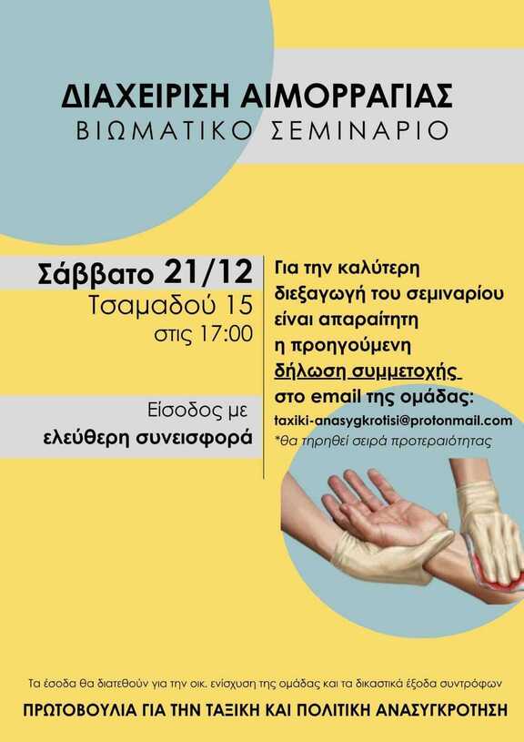 Σας καλούμε να συμμετάσχετε στο σεμινάριο που θα πραγματοποιηθεί το Σάββατο 21/12 στο στέκι μεταναστών στις 18:00 σχετικά με την διαχείριση μαζικής αιμορραγίας. Τα ποσοστά θνησιμότητας μεγάλων αιμορραγιών είναι τεράστια με αποτέλεσμα να συνιστά επιτακτική ανάγκη να γνωρίζουμε πως να αναγνωρίζουμε και να σταματάμε την αιμορραγία με σκοπό την διατήρηση της ζωής. Μια κατάσταση που πρέπει να είμαστε έτοιμη να ανταπεξέλθουμε σε κινηματικό και καθημερινό επίπεδο.