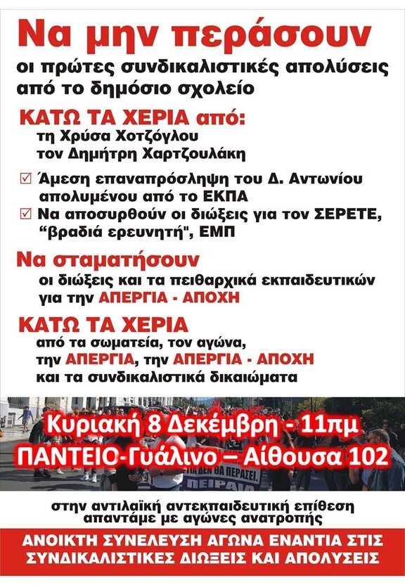Νέα Ανοιχτή Συνέλευση Αγώνα ενάντια στις Συνδικαλιστικές Διώξεις και Απολύσεις - Κυριακή 8/12 στις 11 πμ στο Πάντειο Πανεπιστήμιο (Λεωφ. Συγγρού 136), Γυάλινο Κτίριο, Αίθουσα 102 (είσοδος είτε από Συγγρού είτε από τη συμβολή των οδών Φραγκούδη και Πάντου)