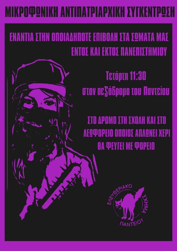 Καλούμε σε αντιπατριαρχική μικροφωνική συγκέντρωση στον πεζόδρομο του Παντείου ενάντια σε (παρα)βιαστές και κάθε μορφή έμφυλης βίας και καταπίεσης την Τετάρτη 11/12, 11:30.