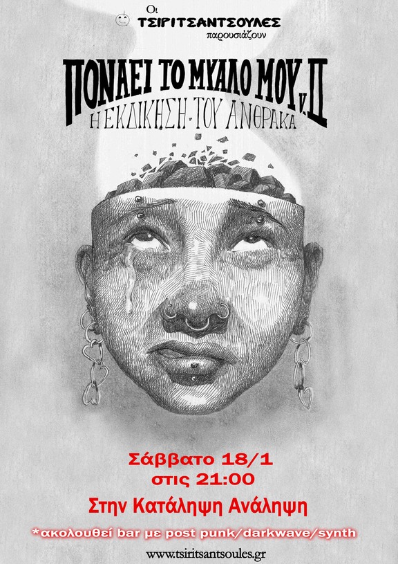 Θεατρική παράσταση με τις Τσιριτσάντσουλες: "Πονάει το μυαλό μου v.II - Η εκδίκηση του άνθρακα" στο πλαίσιο των εκδηλώσεων για τα 10 χρόνια της Κατάληψης Ανάληψης.Μετά το τέλος της παράστασης ακολουθεί μπαρ με post punk/darkwave/synth μουσικές.