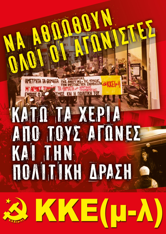 Το ΚΚΕ(μ-λ) καλεί το λαό, τους εργαζόμενους και τη νεολαία, κάθε αγωνιστή και κάθε συλλογικότητα του λαϊκού και εργατικού κινήματος, πολιτικές οργανώσεις, σωματεία και συλλόγους να εκφράσουν με κάθε τρόπο την αλληλεγγύη τους στους διωκόμενους, να καταγγείλουν τις αντιδραστικές και αντιδημοκρατικές μεθοδεύσεις και να απαιτήσουν την παύση κάθε δίωξης και την αθώωση των αγωνιστών.
