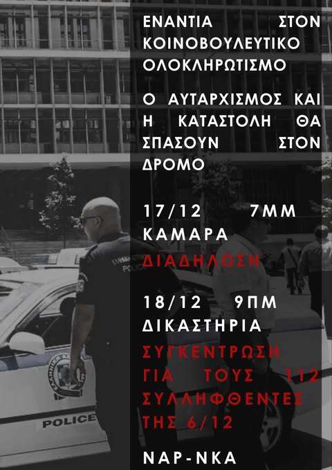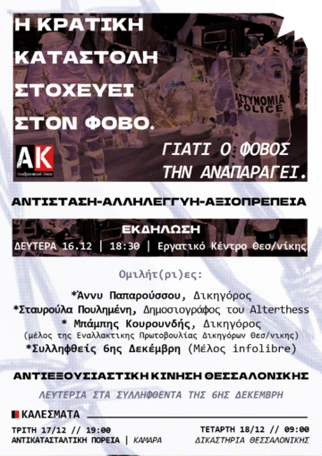 Ολοι και όλες στην διαδήλωση ενάντια στην κρατική καταστολή και τον φόβο, την Τρίτη 17.12.2024, 19:00 στην Καμάρα