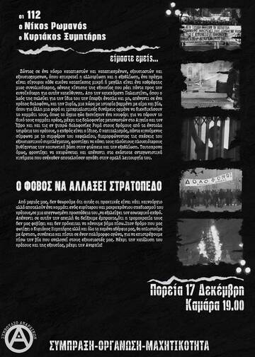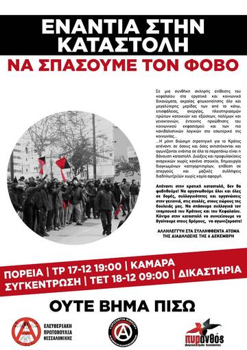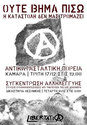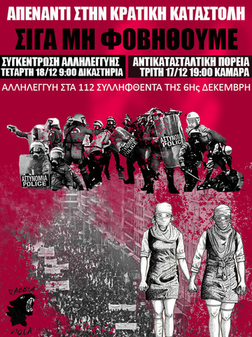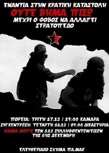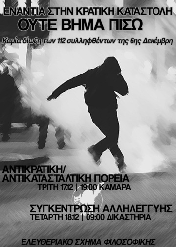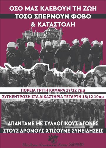 Moreover, we do not forget the gathering at the courts of Thessaloniki for those arrested during the march of 6 December. Wednesday 18/12, at 9am.