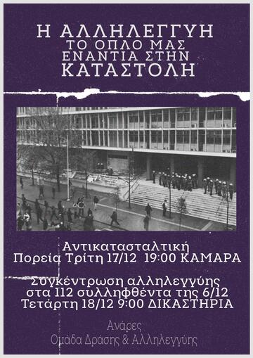 Συγκέντρωση αλληλεγγύης στα συλληφθέντα άτομα της διαδήλωσης της 6ης Δεκέμβρη, Δικαστήρια Θεσσαλονίκης, Τετάρτη 18/12, 09:00