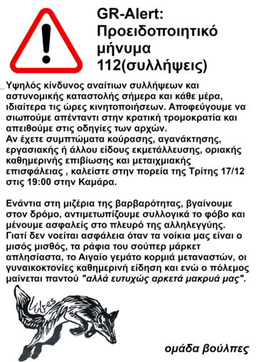 Καλούμε όλους και όλες τους/τις εργαζόμενους/ες να μην φοβηθούν! Να στηρίξουν την πορεία ενάντια στην κρατική καταστολή και τον φόβο, αυτή την Τρίτη 17/12 στις 7μμ στην Καμάρα!