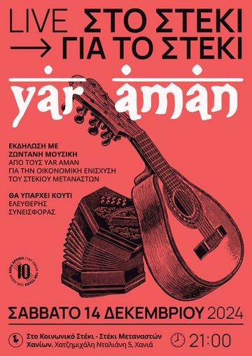 Στο καθιερωμένο live για την ενίσχυση του Στεκιού, το μουσικό σύνολο/συλλογικότητα yar aman θα μας παρουσιάσει τα κομμάτια των φετινών συναντήσεων, ενώ η βραδιά θα συνεχιστεί με μουσικές παρέες, ποτό, συζήτηση και ό,τι άλλο σκαρώσουμε.
