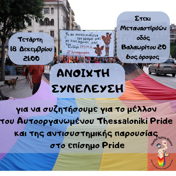 Ο στόχος μας είναι να καλέσουμε το επόμενο διάστημα όλα τα ενδιαφερόμενα άτομα και συλλογικότητες σε συσπείρωση σε έναν νέο συντονισμό για το Αυτοοργανωμένο Thessaloniki Pride και την αντισυστημική παρουσία στο επίσημο Pride. Όμως για να φτάσουμε ως εκεί, θέλουμε πρώτα να ανταλλάξουμε γνώμες με όλα όσα θα θέλατε να συμμετάσχετε στην προετοιμασία του 9ου Αυτοοργανωμένου Thessaloniki Pride, αλλά και ενός αντισυστημικού μπλοκ στο 12ο Thessaloniki Pride. Σας καλούμε, λοιπόν, στην ανοιχτή μας συνέλευση αυτή την Τετάρτη 18 Μαΐου στις 9μμ για να συζητήσουμε ειδικά αυτό το θέμα, είτε πήρατε μέρος στην προετοιμασία παλιότερων Pride είτε όχι.