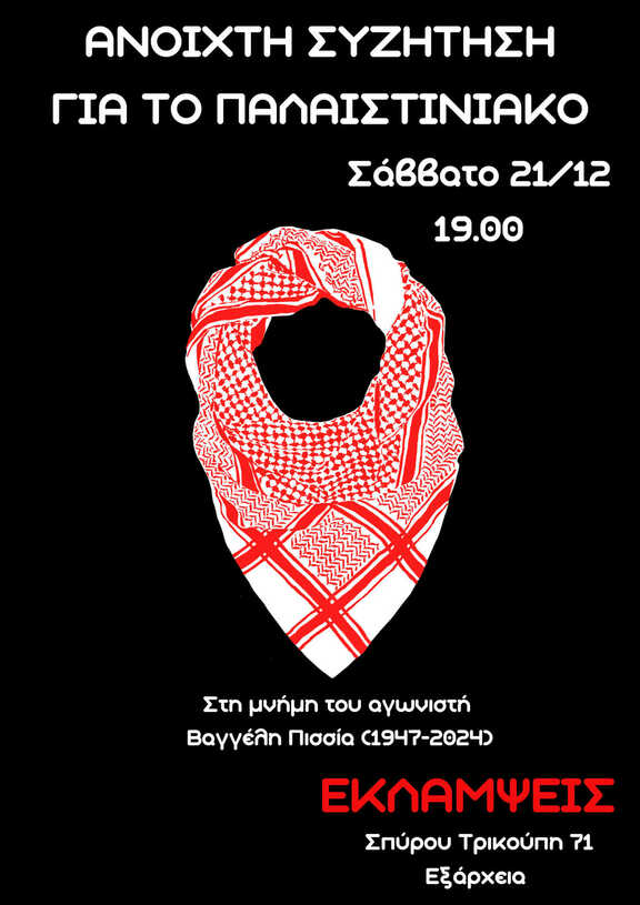 Η συζήτηση γίνεται στη μνήμη του αγωνιστή Βαγγέλη Πισσία που χάθηκε πρόσφατα και αποτελούσε τον άνθρωπο πίσω από την πρωτοβουλία "Ένα καράβι για την Γάζα". (περισσότερα: https://www.shiptogaza.gr/)