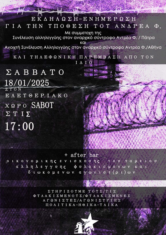 Εκδήλωση-ενημέρωση σχετικά με την υπόθεση του συντρόφου Ανδρέα Φ.