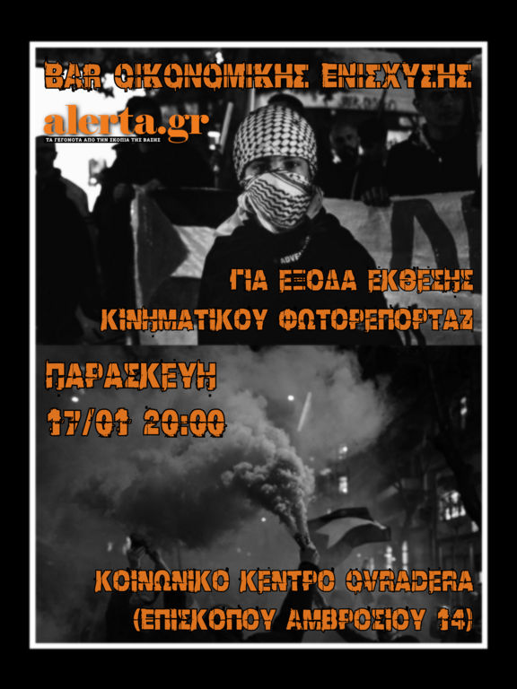 Με βάση όλα τα παραπάνω, αποφασίσαμε μέσα στο επόμενο χρονικό διάστημα την διοργάνωση μιας Έκθεσης Κινηματικού Φωτορεπορτάζ στον χώρο του Κοινωνικού Κέντρου Ovradera (Επισκοπου Αμβροσιου 14) όπου και στεγάζεται το Alerta.gr στην Θεσσαλονίκη. Στην έκθεση αυτή φιλοδοξούμε να αναδείξουμε μια πληθώρα από εικόνες και στιγμές αγώνα μέσα από τους φακούς των διάφορων κινηματικών φωτορεπόρτερ (ή φωτορεπόρτερ που βρίσκονται κοντά στο κίνημα). Για την κάλυψη των λειτουργικών εξόδων της Έκθεσης, διοργανώνουμε ένα μπαρ οικονομικής ενίσχυσης στο Κοινωνικό Κέντρο Ovradera, αυτή την Παρασκευή 17/1, στις 20:00.