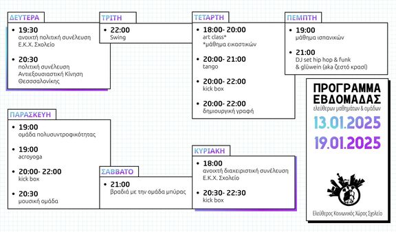 Εβδομαδιαίο Πρόγραμμα του Ελεύθερου Κοινωνικού Χώρου "Σχολείο"