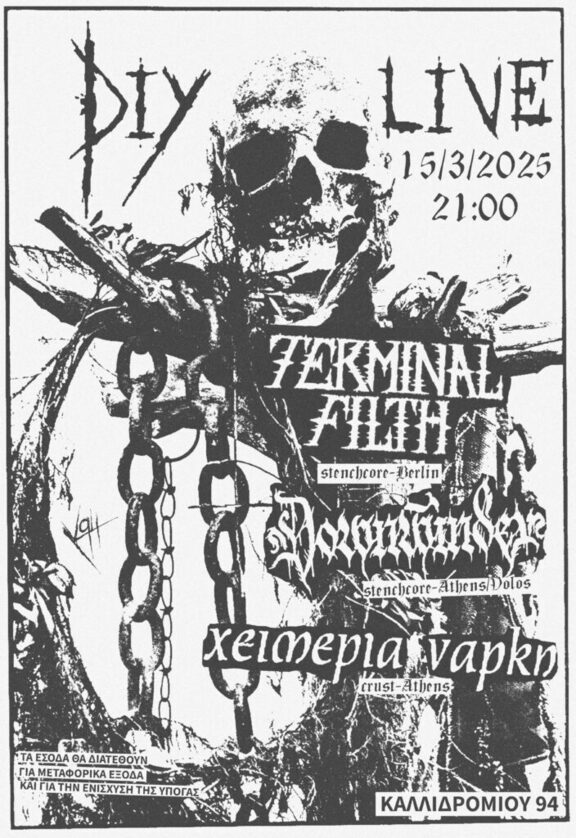 Αυτό το Σάββατο 15 του Μάρτη, συνεχίζουμε με stenchcore και crust σε ένα D.I.Y. live με Downwinder από Βόλο κι Αθήνα, Χειμερία Νάρκη από Αθήνα και Terminal Filth από Βερολίνο.