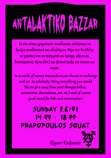 Για τον λόγο αυτό, μέσα στη δυστοπία των εκκενώσεων και της καταστολής που δεχόμαστε, μαζευόμαστε στο Κτήμα Κατάληψης Πραποπούλου στον queer καφενέ να γνωριστούμε, να μοιραστούμε βιώματα και να ενισχύσουμε την κοινότητα μας.