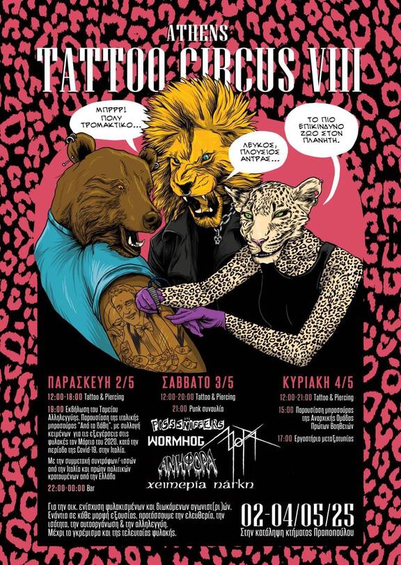 Το Athens Τattoo Circus είναι ένα αυτοοργανωμένο οριζόντιο εγχείρημα που προάγει και στηρίζει την αντικουλτούρα, τους κοινωνικούς/αντιφασιστικούς αγώνες και την αλληλεγγύη στα φυλακισμένα και διωκόμενα άτομα, και στους αγώνες τους μέσα και έξω από τα κελιά. Η διεξαγωγή του γίνεται με την στήριξη/για την στήριξη κατειλημμένων και αυτοδιαχειριζόμενων χώρων, όντας κι εμείς κομμάτι αυτών.