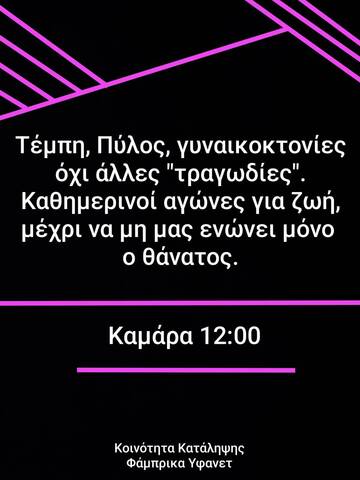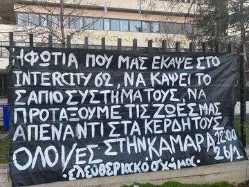 Το έγκλημα στα Τέμπη δεν είναι ξεκομμένο από τα καθημερινά κρατικά και καπιταλιστικά εγκλήματα στους χώρους εργασίας ("εργατικά ατυχήματα"), στα υδάτινα και χερσαία σύνορα (δολοφονίες μεταναστ(ρι)ών), δεν είναι ξεκομμένο από τον πνιγμένο Θεσσαλικό κάμπο και τα καμμένα δάση και σπίτια σε όλη την χώρα, από την Ρόδο μέχρι τον Έβρο. Υπαίτιοι είναι πάντα οι ίδιοι. Το Κράτος και το Κεφάλαιο.