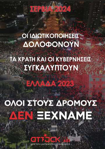 Τη 1 Νοεμβρίου 2024 στο Νόβι Σαντ της Σερβίας, η στέγη πάνω από την κύρια είσοδο του σιδηροδρομικού σταθμού της πόλης κατέρρευσε, οδηγώντας στον θάνατο 15 ανθρώπων, ενός στεγάστρου υποτιθέμενα προσφάτως ανακαινισμένου από ιδιωτικές εταιρείες σε συνεργασία με το Σερβικό κράτος. Η ξεκάθαρη κρατική δολοφονία οδήγησε τον λαό της χώρας σε μια μακρά περίοδο κοινωνικής αναταραχής που διαρκεί μέχρι και σήμερα. Ακριβώς όπως και στην Ελλάδα, έτσι και στη Σερβία, ο κόσμος βρίσκεται καθημερινά στον αγώνα πραγματοποιώντας τεράστιες πορείες και κινητοποιήσεις, καταλαμβάνοντας τα 2/3 των πανεπιστημίων της χώρας, προχωρώντας σε γενικές απεργίες και συγκρούσεις με τις δυνάμεις της καταστολής, απαιτώντας δικαίωση.