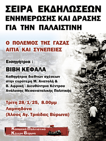 Την Τρίτη 28/1/25 στις 8.00μμ, στην Λαμπηδόνα (άλσος Αγ. Τριάδας Βύρωνα), θα μας μιλήσει η κα Βιβή Κεφαλά, καθηγήτρια Διεθνών Σχέσεων στην ευρύτερη Μέση Ανατολή και Βόρεια Αφρική και Διευθύντρια του Κέντρου Ανάλυσης Μεσανατολικής Πολιτικής (ΚΕ.Α.ΜΕ.Π.) με θέμα: «Ο πόλεμος της Γάζας: αίτια και συνέπειες». Θα ακολουθήσει συζήτηση.