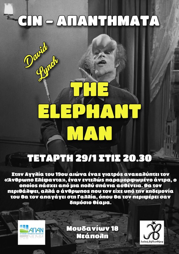 Νέος κύκλος ταινιών, με αφιέρωμα στον David Lynch. Αυτήν την Τετάρτη 29/1 στις 20.30 η προβολή της ταινίας "The Elephant Man".