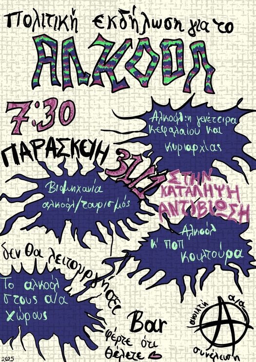 Την Παρασκευή 31/1 στις 7:30 μ.μ. σας καλούμε στην κατάληψη αντιβίωση, για να μοιραστούμε τα συμπεράσματα και τα ερωτήματα που μας προέκυψαν κάτα την διάρκεια των συνελέυσεων μας με θέμα το αλκόολ, αλλά και να συζητήσουμε παρέα περι του θέματος.