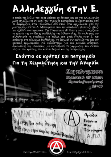 Να σταθούμε απέναντι στο κύκλωμα trafficking, τη θεσμική του συγκάλυψη και την κρατική τρομοκρατία. Να αγωνιστούμε για μια κοινωνία ισότητας, δικαιοσύνης και ελευθερίας, με κατεύθυνση το γκρέμισμα του σάπιου κόσμου του κράτους, του καπιταλισμού και της πατριαρχίας