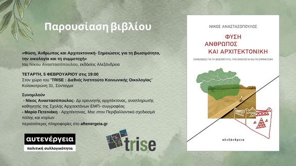 Η αυτοοργανωμένη πολιτική συλλογικότητα Αυτενέργεια σας προσκαλεί στην 1η παρουσίαση του βιβλίου «Φύση, Άνθρωπος και Αρχιτεκτονική - Σημειώσεις για τη βιωσιμότητα, την οικολογία και τη συμμετοχή» του Νίκου Αναστασόπουλου, εκδόσεις Αλεξάνδρεια, την Τετάρτη 5 Φεβρουαρίου στις 19:00.