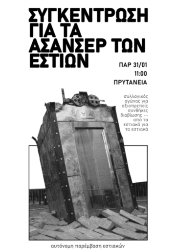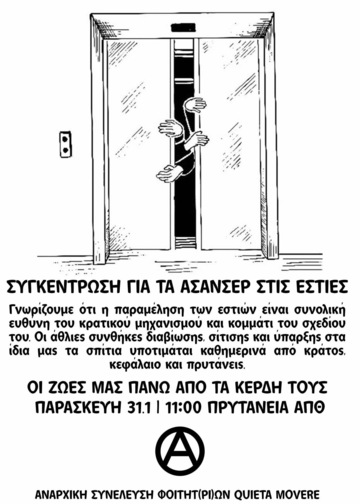 Καλούμε σε συγκέντρωση την Παρασκευή 31.1 στις 11:00 στην πρυτανεία, για να διαμαρτυρηθούμε για το ζήτημα των ασανσέρ και να ζητήσουμε απαντήσεις-δεσμεύσεις από τους υπεύθυνους.