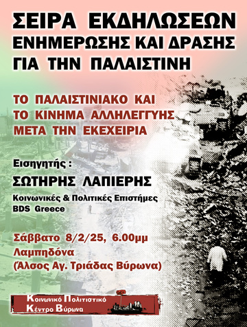 Tο Σάββατο 8/2/25 στις 6.00μμ, στην Λαμπηδόνα (άλσος Αγ. Τριάδας Βύρωνα), θα μας μιλήσει ο Σωτήρης Λαπιέρης (κοινωνικές & πολιτικές επιστήμες) από το BDS Greece, με θέμα: «Το παλαιστινιακό και το κίνημα αλληλεγγύης μετά την εκεχειρία». Θα ακολουθήσει συζήτηση.