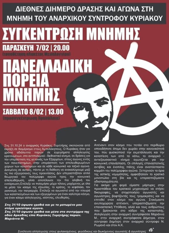 Στις 31.10.24 ο αναρχικός Κυριάκος Ξυμητήρης σκοτώνεται από έκρηξη σε διαμέρισμα στους Αμπελόκηπους. Ο Κυριάκος ήταν για χρόνια αδιάλειπτα παρών σε εγχειρήματα αλληελγγύης κρατουμένων, στο αντιπολεμικό-διεθνιστικό κίνημα, σε δράσεις για την υπεράσπιση της γειτονιάς των Εξαρχείων, στους αγώνες εντός των πανεπιστημίων, στην υπεράσπιση των απελευθερωμένων χώρων των καταλήψεων και σε κάθε κοινωνικό και ταξικό αγώνα. Δοσμένος σε αυτούς, πάντα με τη διάθεση να ανακαλύψουμε μαζί τις πιο εξεγερσιακές τους προεκτάσεις. Δεν υπερασπιζόταν απλά θεωρητικά τον πολύμορφο αγώνα προς την κοινωνική απελευθέρωση, αλλά αποτελούσε την πιο αληθινή του ενσάρκωση. Επέλεξε να πολεμήσει μέχρι τέλους μαχόμενος με όλα τα μέσα τον κόσμο της εξουσίας, το κράτος, το κεφάλαιο, τον ρατσισμό, την πατριαρχία. Επέλεξε να αγωνιστεί από την πλευρά των καταπιεσμένων και των εξεγερμένων για έναν καλύτερο κόσμο, για έναν κόσμο αλληλεγγύης, ισότητας, ελευθερίας.
