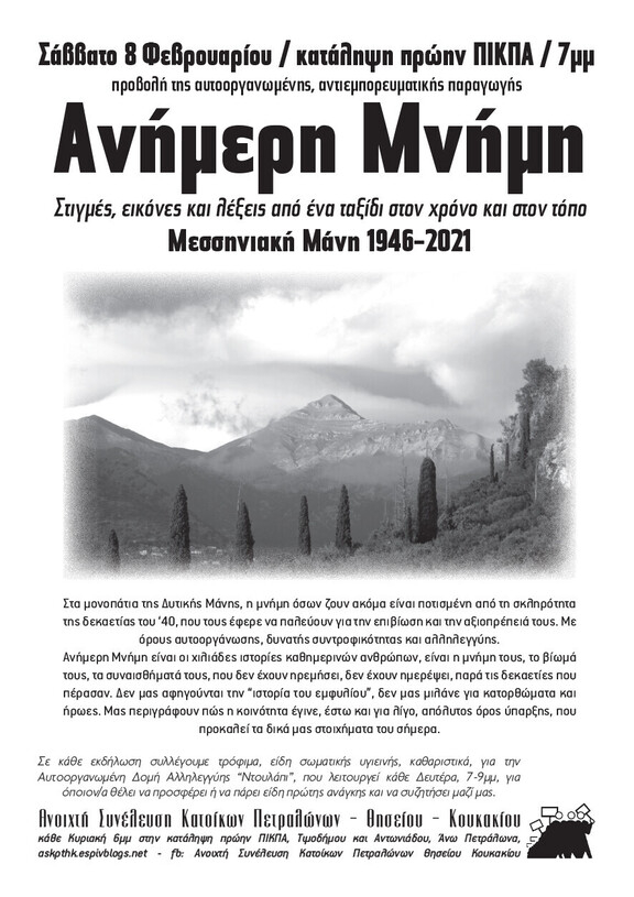 Προβολή του ντοκιμαντέρ Ανήμερη Μνήμη / Σάββατο 8 Φεβρουαρίου / κατάληψη πρώην ΠΙΚΠΑ / 7µµ