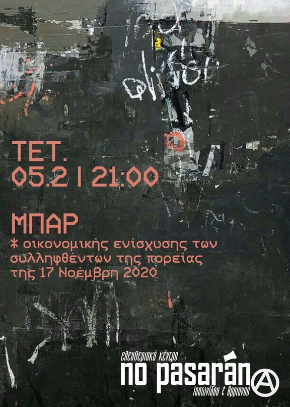 Μπαρ οικονομικής ενίσχυσης των συλληφθέντων της πορείας της 17 Νοέμβρη του 2020 στο Ελευθεριακό κέντρο "No pasaran"