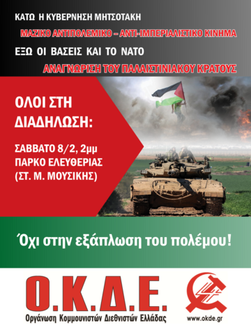 Στην Ελλάδα, οι δολοφόνοι των Τεμπών συμβάλουν ενεργά στη γενοκτονία των Παλαιστινίων και συντάσσονται με τα φιλοπόλεμα σχέδια των Δυτικών ιμπεριαλιστών. Ο ελληνικός καπιταλισμός δεν «εμπλέκεται» απλά, αλλά συμμετέχει από την πρώτη γραμμή δίνοντας γη και ύδωρ σε ΗΠΑ-ΝΑΤΟ-ΕΕ (βάσεις, εξοπλισμούς, στρατιωτικές ασκήσεις και εκπαίδευση, προπαγάνδα κ.λπ.) στους Σιωνιστές και στο μισοφασιστικό καθεστώς Ζελένσκι. Παίρνει αναγκαίους πόρους από υγεία, παιδεία και άλλες κοινωνικές δαπάνες για να τους σπαταλήσει στο 4% του ΑΕΠ σε εξοπλισμούς! Ετοιμάζεται μέχρι και για αντιπυραυλικό "θολό" αξίας δισεκατομμυρίων. Η συμμετοχή του ελληνικού καπιταλισμού είναι συνειδητή ταξική πολιτική μετατρέποντας την Ελλάδα σε ορμητήριο των Δυτικών ιμπεριαλιστών, ενώ ταυτόχρονα επιτίθεται με μανία στους εργαζομένους και τη νεολαία. Αξιοποιεί δεξιές και ακροδεξιές, πατριδοκάπηλες, τυχοδιωκτικές κορώνες όπως «εθνικά συμφέροντα» για να αποπροσανατολίσει, να επιβάλλει ένα καθεστώς υπερεκμετάλλευσης και εξαθλίωσης, όπου το ένα νεοφιλελεύθερο έγκλημα ακολουθεί το άλλο (συγκάλυψη Τεμπών, ιδιωτικοποιήσεις υγείας - παιδείας, κ.ο.κ.).