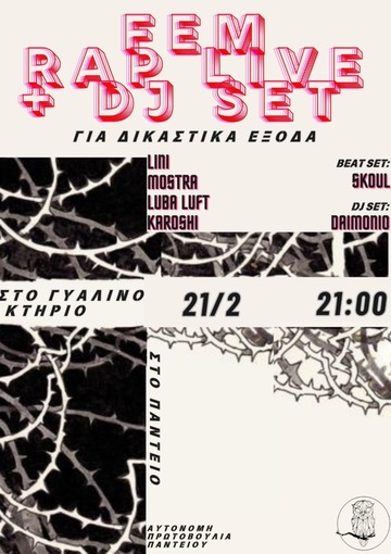 Την Παρασκευή 21 Φεβρουαρίου, σας περιμένουμε όλα στο γυάλινο του Παντείου παρέα με τις lini, m0stra, luba luft, karoshi, skoul και daimonio στο live + dj set οικονομικής ενίσχυσης για τα δικαστικά έξοδα των δύο συντροφισσών μας.