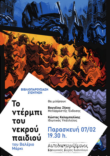 Την Παρασκευή 07 Φεβρουαρίου, μετά τις 7.30 μ.μ. συζητάμε με τον Βαγγέλη Ζήκο (ο μεταφραστής) και τον Κώστα Καλαμπαλίκη (ιδ. υπάλληλος) για το βιβλίο "Το ντέρμπι του νεκρού παιδιού" του Βαλέριο Μάρκι.