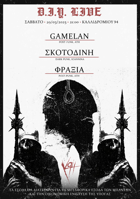 To Σάββατο 29 Μαρτίου στις 21:00 , dark punk/ post-punk D.I.Y. live με Φράξια και Gamelan από Αθήνα, και Σκοτοδίνη από Ιωάννινα.