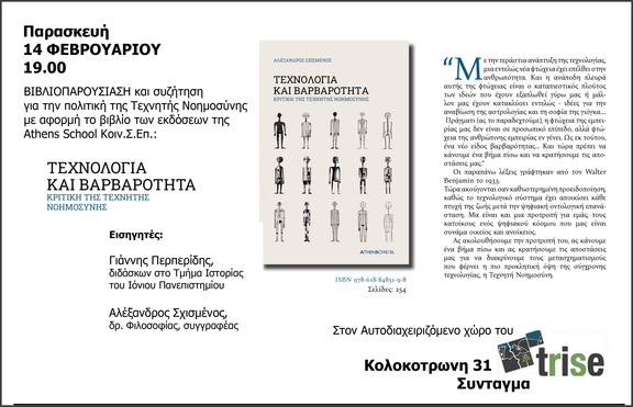 Σας προσκαλούμε στον Αυτοδιαχειριζόμενο Χώρο TRISE (Κολοκοτρώνη 31, Σύνταγμα) την Παρασκευή 14 Φεβρουαρίου στις 19.00 για μια δημόσια συζήτηση για τις πολιτικές επιπτώσεις της ΤΝ με αφορμή την έκδοση του βιβλίου του δρ. Φιλοσοφίας Αλέξανδρου Σχισμένου ΤΕΧΝΟΛΟΓΙΑ ΚΑΙ ΒΑΡΒΑΡΟΤΗΤΑ: ΚΡΙΤΙΚΗ ΤΗΣ ΤΕΧΝΗΤΗΣ ΝΟΗΜΟΣΥΝΗΣ (εκδ. Athens School).