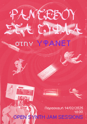 Τα μηχανηματάκια μας πλένονται, χτενίζονται, κάνουνε μποτέ και πάνε στη ΦΑΜΠΡΙΚΑ ΥΦΑΝΕΤ (Ομήρου με Περδίκα γωνία, Κάτω Τούμπα), για τον επόμενο γύρο speed dating for machines! Η κληρωτίδα ανακοινώνει τα ζευγάρια των μηχανημάτων που θα παίξουν μαζί και αυτά αφού πάρουν λίγο χρόνο να γνωριστούν πίνοντας μ̵ι̵α̵ ̵π̵α̵γ̵ω̵μ̵έ̵ν̵η̵ ̵μ̵π̵υ̵ρ̵ί̵τ̵σ̵α̵ υγρό ηλεκτρικών επαφών, θα έχουν 20 λεπτά να αυτοσχεδιάσουν χέρι-χέρι ή knob-knob ![]()