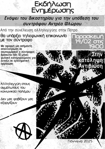 Εκδήλωση Ενημέρωσης ενόψει του δικαστηρίου του συντρόφου Αντρέα Φλώρου, από την συνέλευση αλληλεγγύης στην Πάτρα