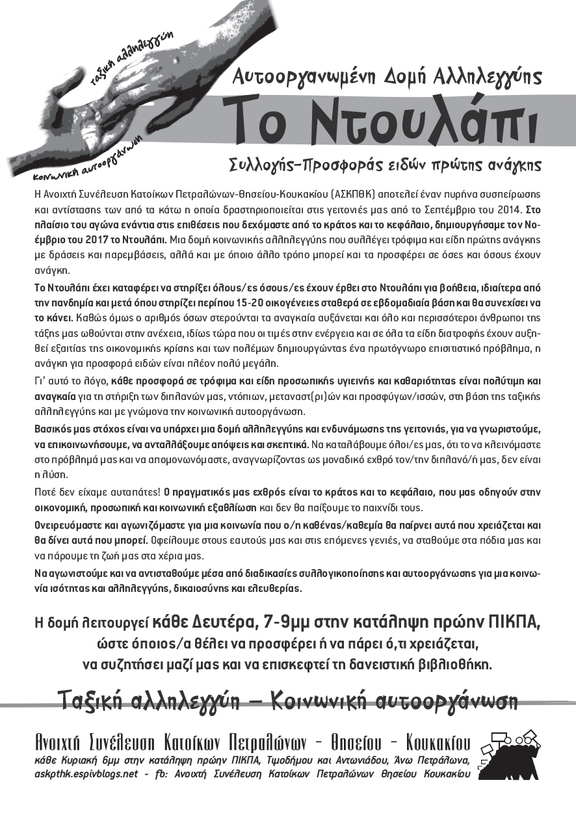 Η Ανοιχτή Συνέλευση Κατοίκων Πετραλώνων-Θησείου-Κουκακίου (ΑΣΚΠΘΚ) αποτελεί έναν πυρήνα συσπείρωσης και αντίστασης των από τα κάτω η οποία δραστηριοποιείται στις γειτονιές μας από το Σεπτέμβριο του 2014. Στο πλαίσιο του αγώνα ενάντια στις επιθέσεις που δεχόμαστε από το κράτος και το κεφάλαιο, δημιουργήσαμε τον Νοέμβριο του 2017 το Ντουλάπι. Μια δομή κοινωνικής αλληλεγγύης που συλλέγει τρόφιμα και είδη πρώτης ανάγκης με δράσεις και παρεμβάσεις, αλλά και με όποιο άλλο τρόπο μπορεί και τα προσφέρει σε όσες και όσους έχουν ανάγκη.